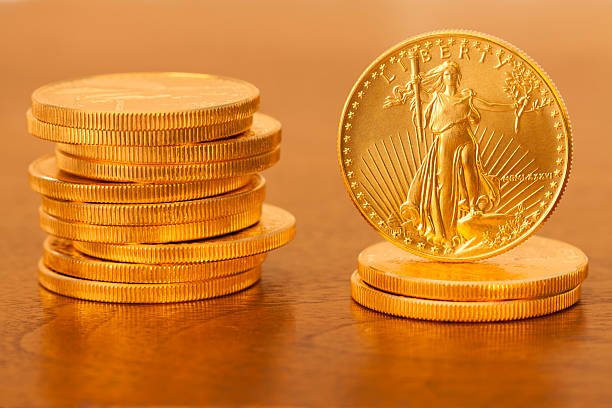 American Gold Dollar Coins Stacked, with selective focus on office desk