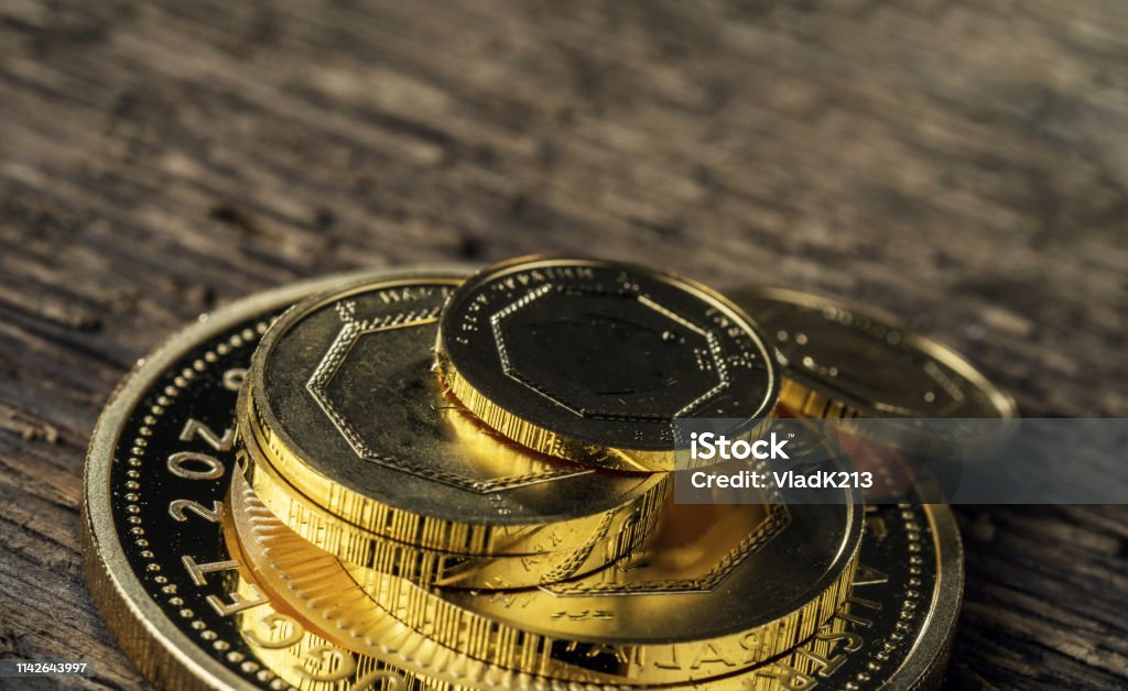 A few gold coins fineness 999.9 on a background of blurred wood texture.