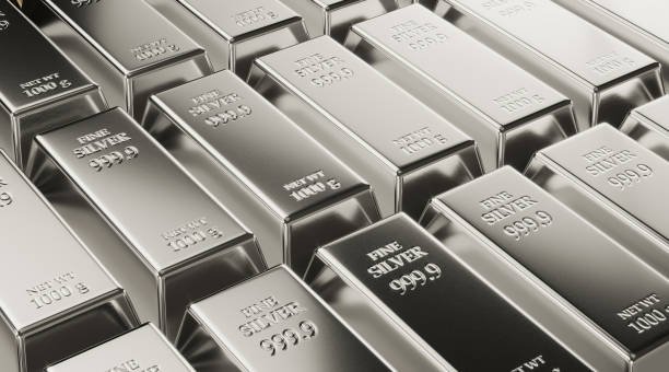 Photorealistic 3d render of silver bars sitting next to each other. Commodity trading concept. Horizontal composition with copy space.