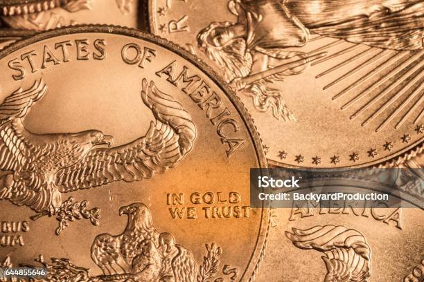 Gold Eagle one ounce coin against a golden background of other coins with focus on the Liberty symbol